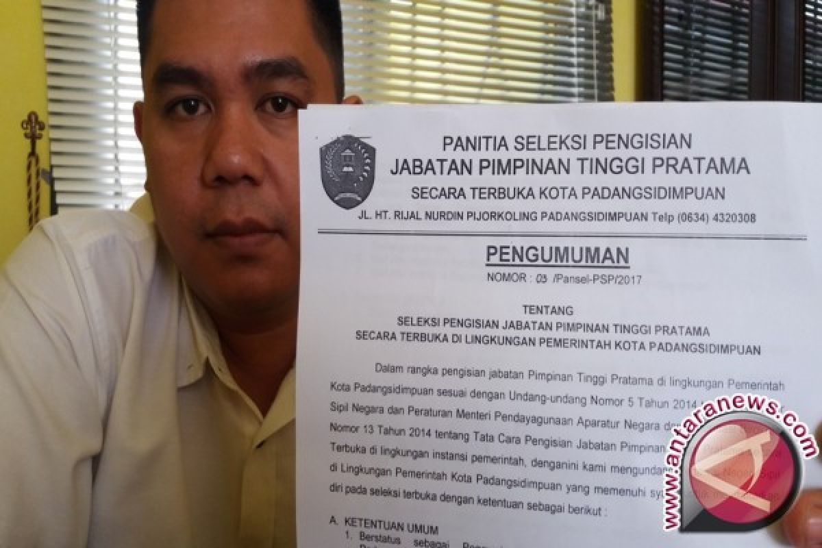 Ketua pansel lelang jabatan pimpinan tinggi pratama, H Zulfeddi Simamora, melalui Kabid Mutasi dan Pengembangan Karir, Badan Kepegawaian Daerah Kota Padangsidimpuan, Sofyan Arifin Hasibuan, mengatakan, Jum'at, dari hasil seleksi berkas peserta lelang jabatan pimpinan tinggi pratama di Lingkungan Pemkot Padangsidimpuan sudah selesai, hasil keputusan tersebut sudah mutlak karena melibatkan panitia dari kalangan akademik, sehingga hasil dari wawancara dan seleksi berkas tidak perlu diragukan, ucapnya.