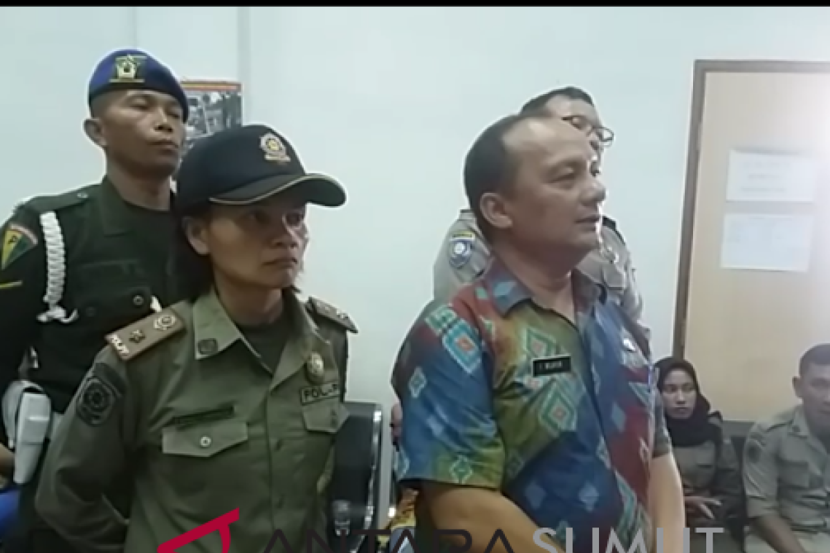 KETERANGAN  : Kasat Pol PP Labura Irwansyah Wijaya SSos MAP didampingi kabidnya dan personil dari Polres Labuhanbatu serta PM memberikan keterangan kepada wartawan terkait operasi yang dilaksanakan, Kamis. (Foto : Antaranews Sumut/Sukardi)