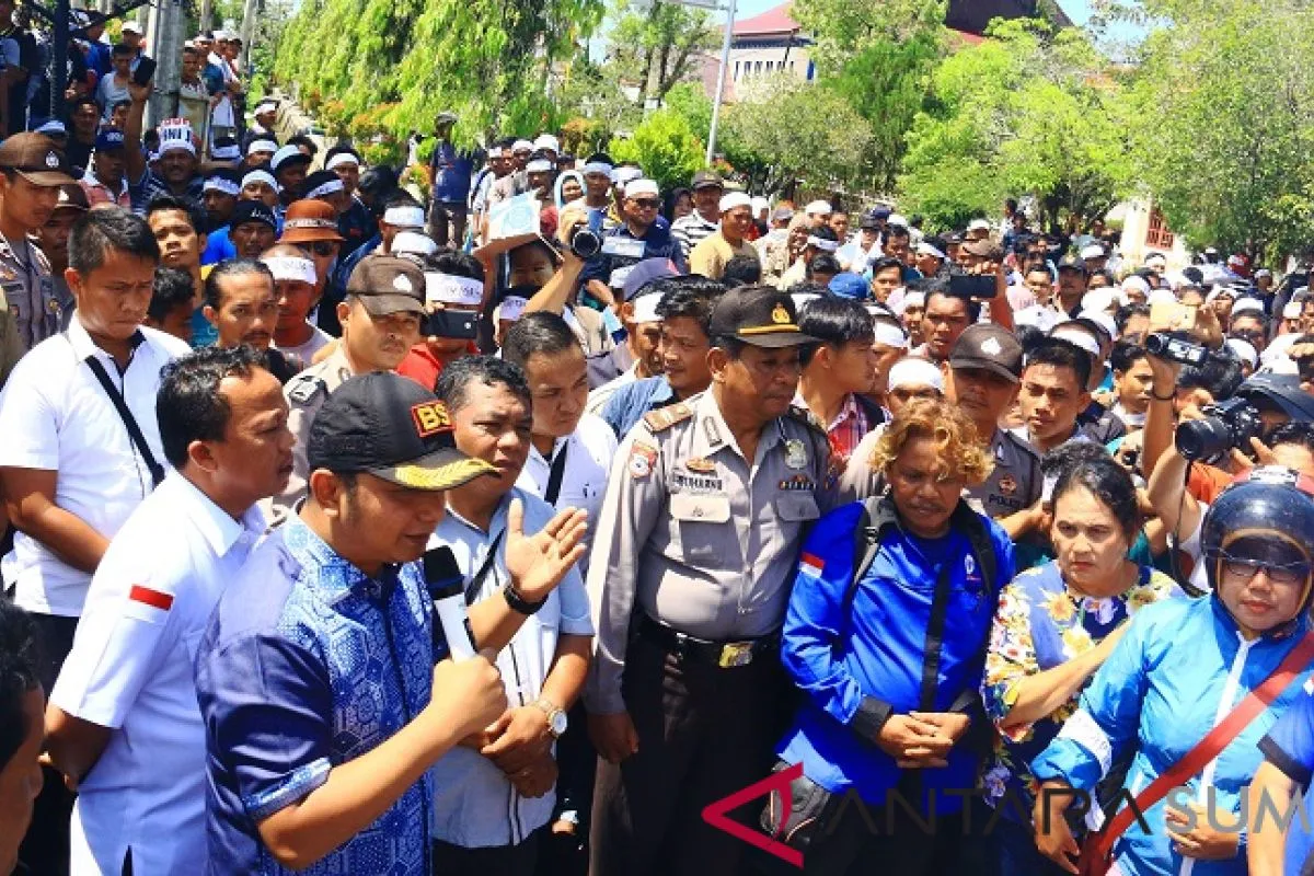 “Saya menghargai kedatangan para nelayan, dan sebagai rasa kepedulian saya kepada para nelayan, saya sampai menunda keberangkatan saya ke Medan untuk menghadiri rapat. Karena aksi ini berkaitan dengan masyarakat banyak dan kebutuhan hidup. Saya berharap bapak dan ibu dapat memahami posisi kami selaku pemerintah daerah yang tidak bisa melampaui kebijakan dari pusat,”tandasnya.