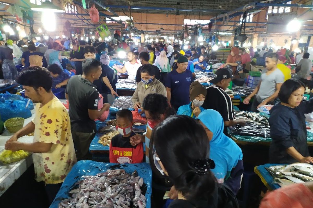 Pematangsiantar (ANTARA) - Menjelang empat hari Idul Fitri 1441 Hijriyah atau Lebaran tahun 2020, lods tempat penjualanan ikan di Pasar Dwikora, Parluasan, Kota Pematangsiantar, Rabu (19/5), ramai pembeli.
