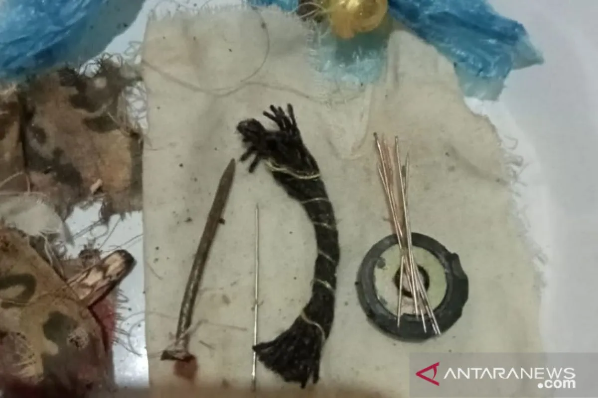 Bungkusan ke 2, berisi 1 ikat Rambut boneka, 1 magnet, jarum 7 biji, di bungkus kain kapan kemudian di bungkus dengan plastik warna biru. Dari ketiga benda yang kami temukan semuanya dibungkus kain kafan layaknya seperti mengemas mayat, tutupnya.