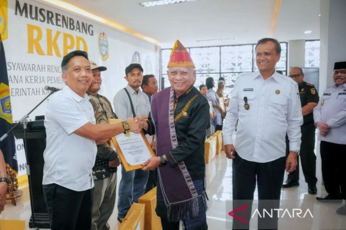 Wakil Gubernur Sumut Surya (tengah) menyerahkan piagam dalam pembukaan Musrenbang RKPD Pakpak Bharat 2026 di Gedung Perpustakaan Pakpak Bharat, Kabupaten Pakpak Bharat, Sumut Rabu (30/4/2025). ANTARA/HO-Diskominfo Sumut