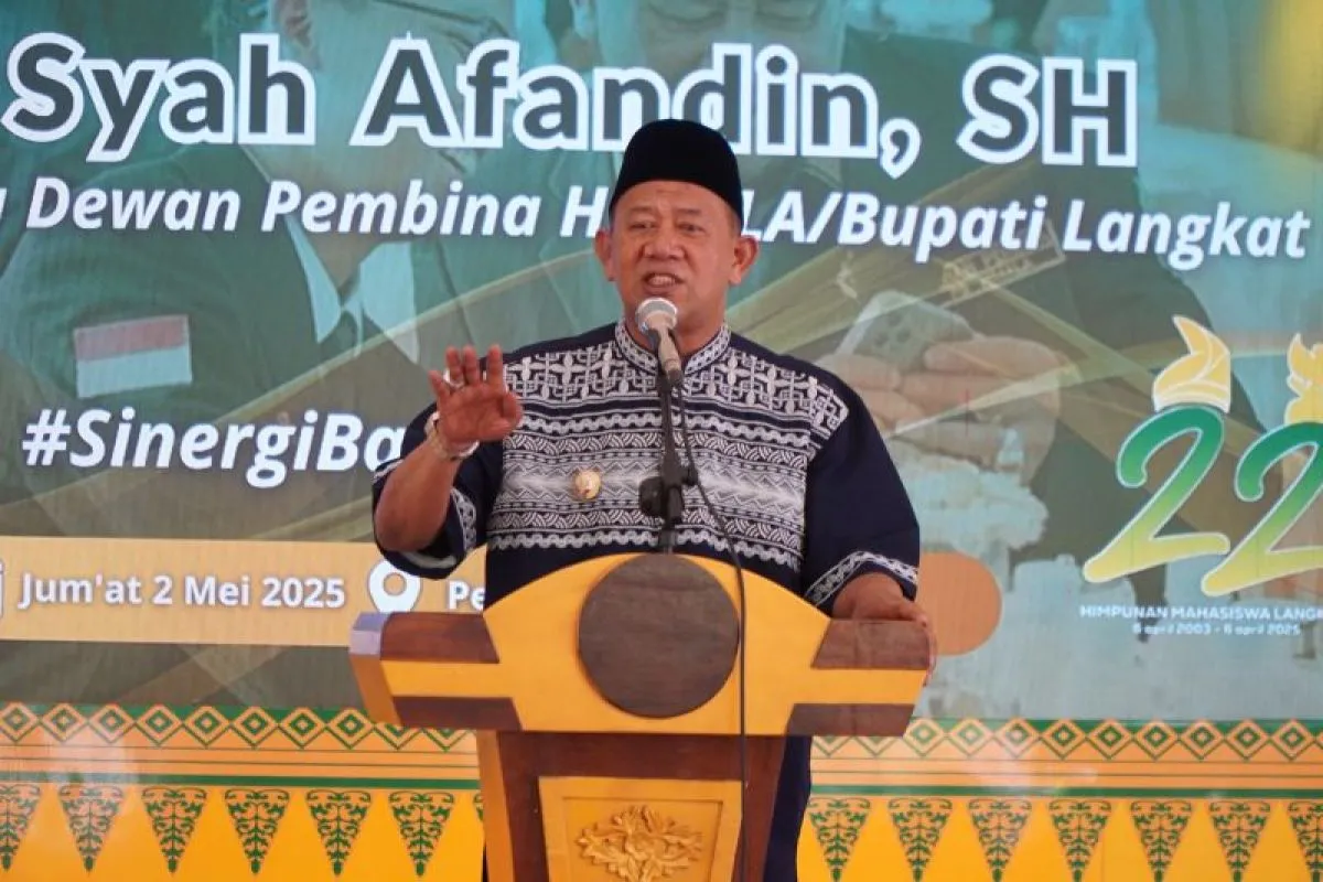 Langkat (ANTARA) - Bupati Langkat Syah Afandin menghadiri Milad Ke-22 Himpunan Mahasiswa Langkat (Himala) dengan mengusung tema “Sinergi Bangun Langkat”, menggambarkan semangat kolaborasi antara mahasiswa, pemerintah, dan masyarakat dalam mendorong pembangunan di negeri bertuah itu