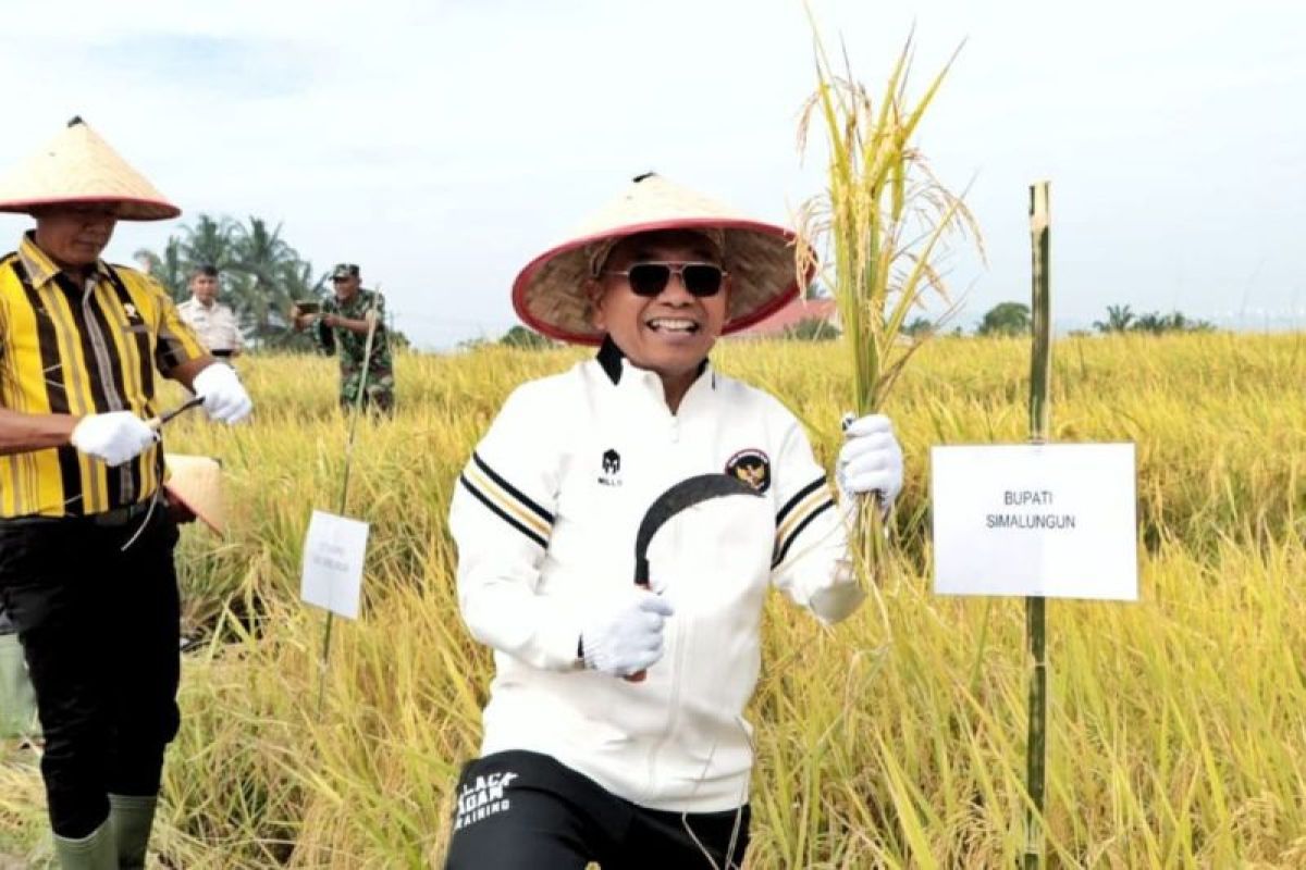 Bupati Simalungun Anton Achmad Saragih memotong padi pada kegiatan panen raya padi di Nagori Muara Mulia, Kecamatan Tanah Jawa. ANTARA/ HO-Kominfo Simalungun
