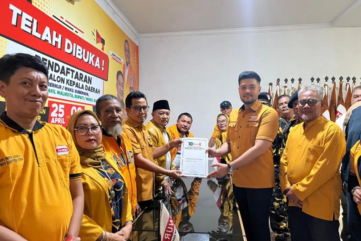 Medan (ANTARA) - El Adrian Shah SE MIP membuktikan niatnya untuk maju dalam kontestasi bursa pemilihan Ketua DPD Partai Hanura Provinsi Sumatera Utara dengan menyerahkan berkas pendaftaran ke Sekretariat DPD Hanura Sumut Jalan Sei Besitang Nomor 4 Medan, Jumat (18/7/2025).