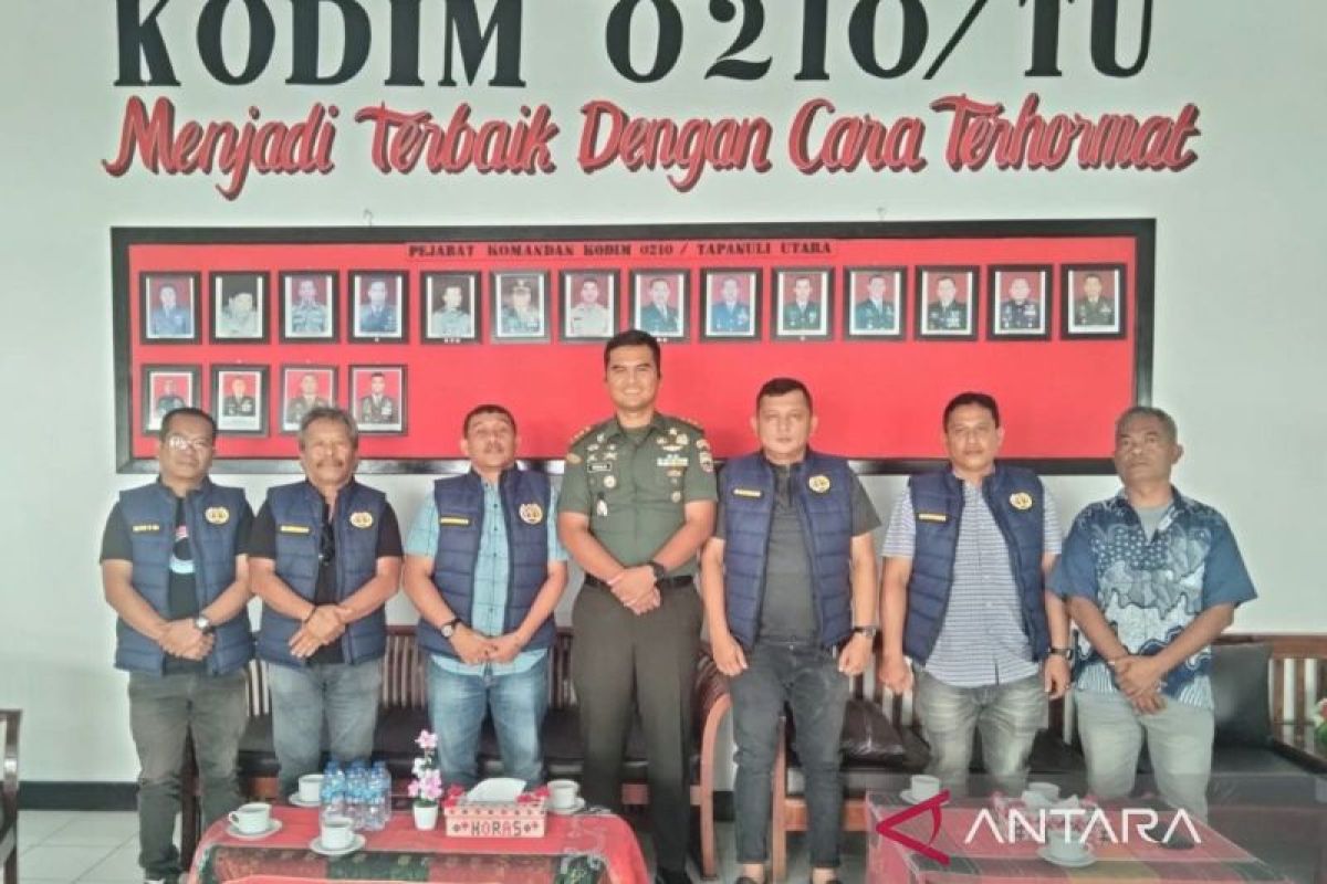 Tapanuli Utara (ANTARA) - Ketua PWI Bonapasogit Alfonso Situmorang bersama jajaran mengunjungi ruang kerja Dandim 0210 TU, Letkol Kav Ronald Tampubolon, dalam agenda silaturahmi dan sekaligus perkenalan pengurus periode 2025-2028 serta diskusi terbatas menyoal pelaksanaan program Makan Bergizi Gratis yang saat ini sudah mulai diterapkan di sejumlah sekolah di wilayah Tapanuli Utara.