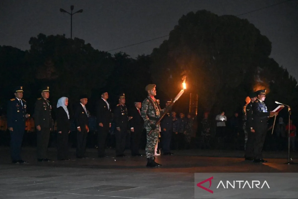 "Dalam rangka memperingati Hari Proklamasi Kemerdekaan ke-80 Republik Indonesia, kami yang hadir di sini, Minggu, 17 Agustus 2025, pukul 00.00 WIB, pada upacara mengenang arwah dan jasa para pahlawan nusa dan bangsa yang telah bersemayam di taman makam ini," kata Rio.