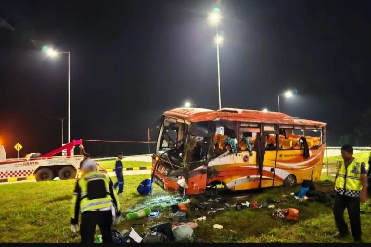 Namun nahas bus tersebut mengalami kecelakaan tunggal ketika melintas di jalan Tol Padang-Sicincin, tepatnya di pintu keluar tol.
