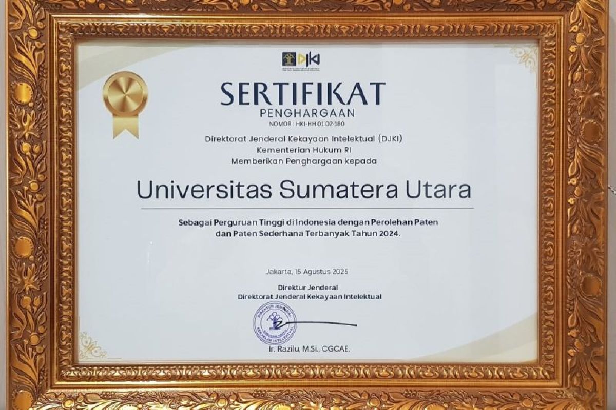 Medan (ANTARA) - Universitas Sumatera Utara (USU) mencatat sejarah baru dalam bidang Hak Kekayaan Intelektual (HKI). Direktorat Jenderal Kekayaan Intelektual (DJKI) Kementerian Hukum RI menobatkan USU sebagai perguruan tinggi dengan jumlah paten terbanyak di Indonesia tahun 2024.
