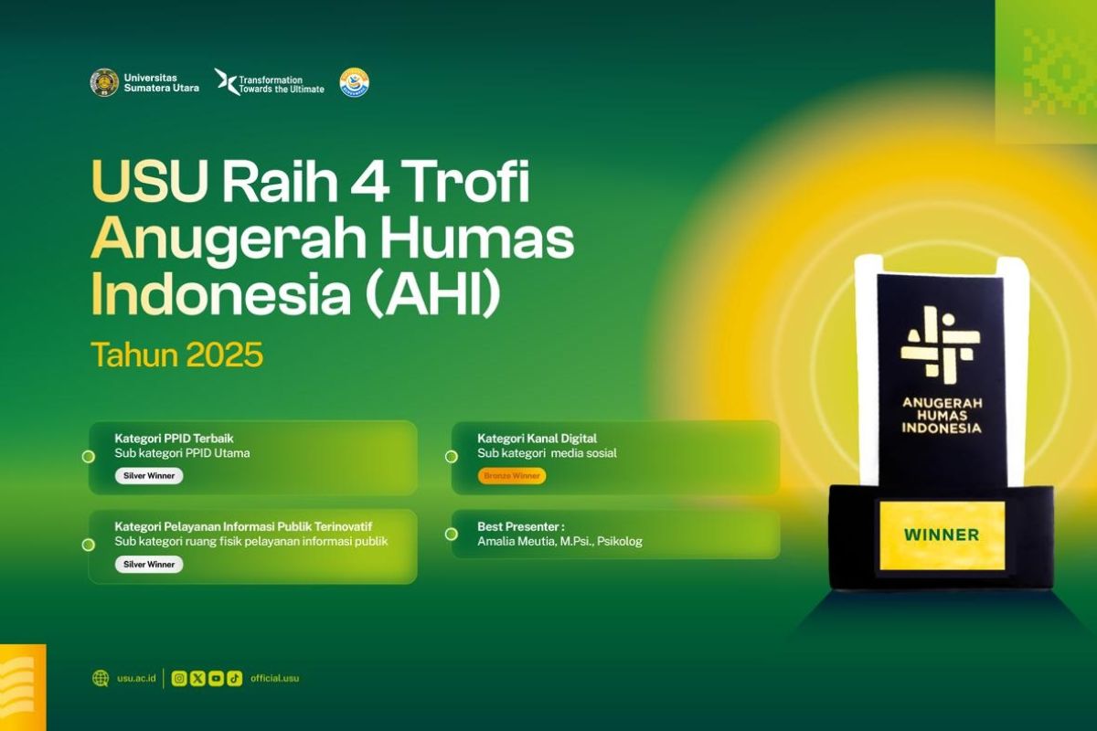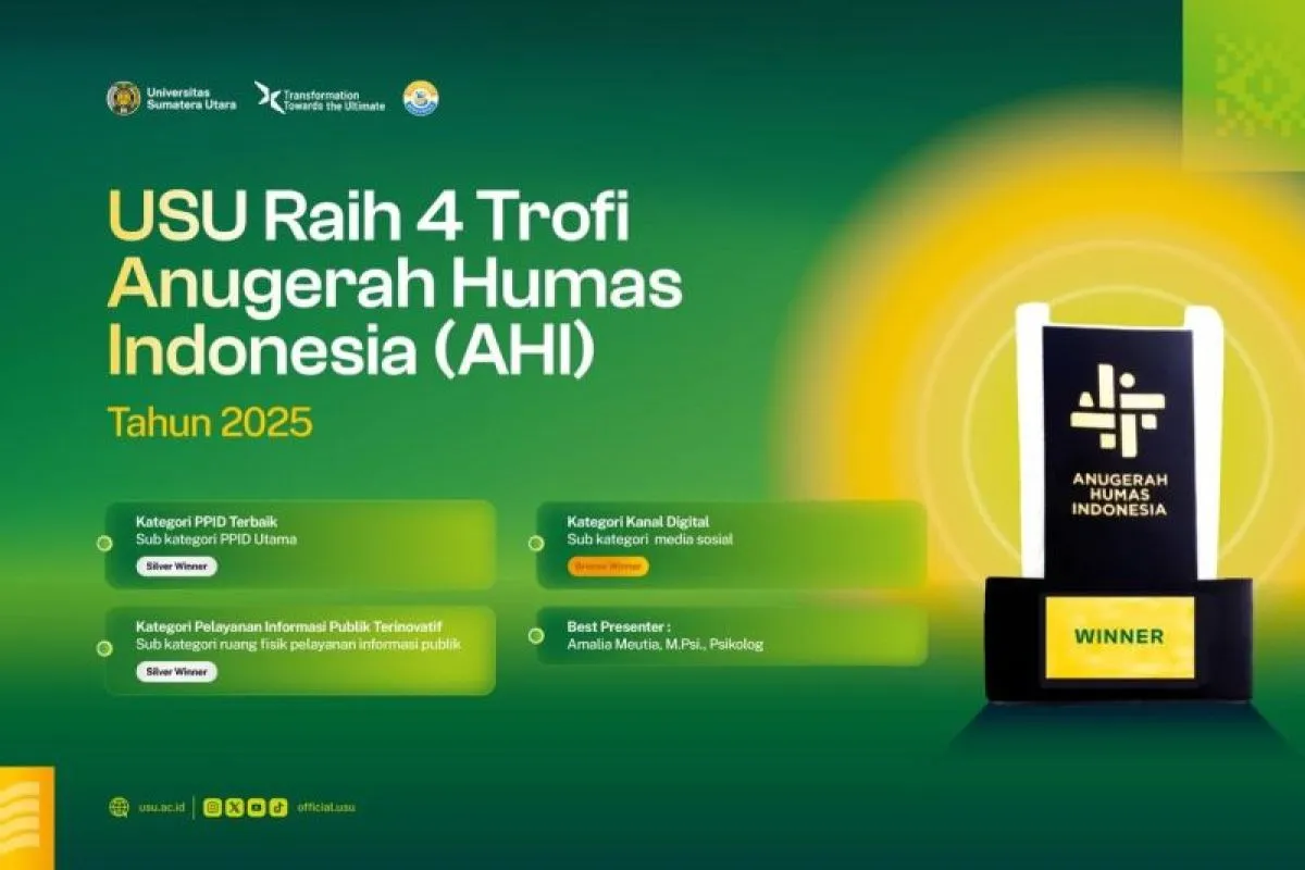 Medan (ANTARA) - Universitas Sumatera Utara (USU) kembali meraih penghargaan di ajang Anugerah Humas Indonesia (AHI). Pada tahun ini, USU meraih Silver pada Kategori PPID Terbaik dan Kategori Pelayanan Informasi Publik Terinovatif, sementara untuk Kategori Kanal Digital, USU mendapatkan Bronze. Penghargaan Best Presenter diraih Amalia Meutia, M.Psi., Psikolog.