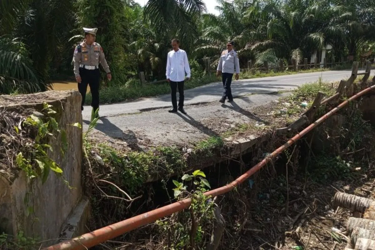 Langkat (ANTARA) - Kasat Lantas Polres Langkat beserta Dinas Perhubungan dan PUTR lakukan peninjauan dan melihat dari dekat kondisi jembatan rusak/turun melengkung, pada jembatan Panjang, di Desa Besilam Kecamatan Padang Tualang, guna memastikan keamanan pengendara bila melintas.