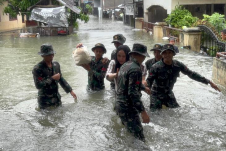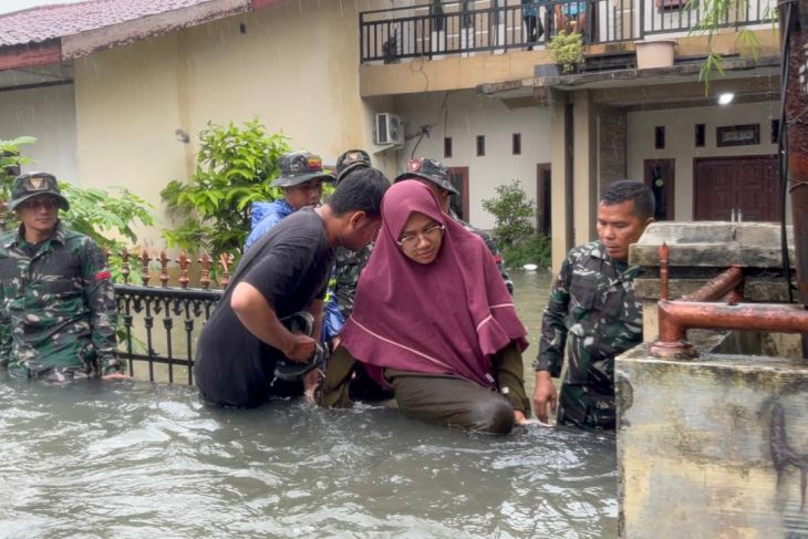 Medan (ANTARA) - Prajurit Yonkav 6/NK bergerak cepat mengevakuasi warga yang terjebak banjir dengan ketinggian 1,5 meter di Lingkungan V, Kelurahan Asam Kumbang, Kota Medan, Kamis.