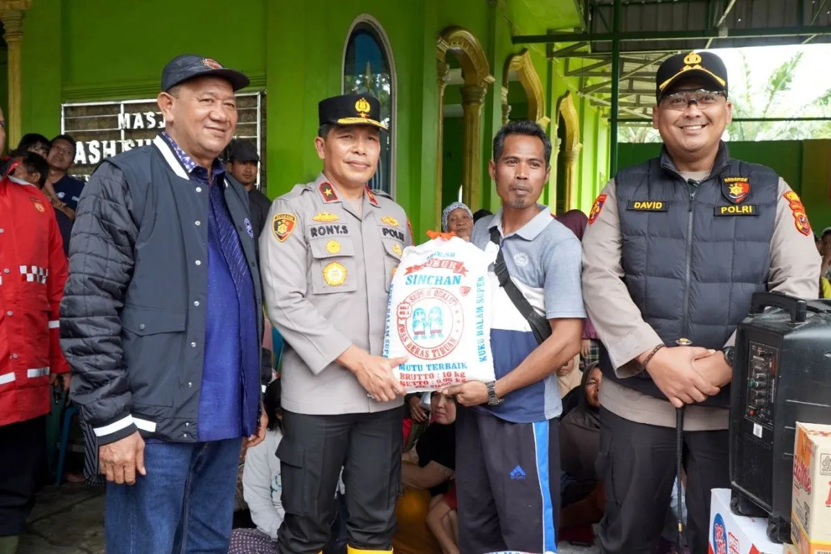 Langkat (ANTARA) - Bupati Langkat Syah Afandin bersama Wakapolda Sumatera Utara, Brigjen Pol Rony Samtana meninjau sekaligus menyalurkan bantuan bagi warga terdampak banjir di Kecamatan Hinai, Kabupaten Langkat, Jumat.