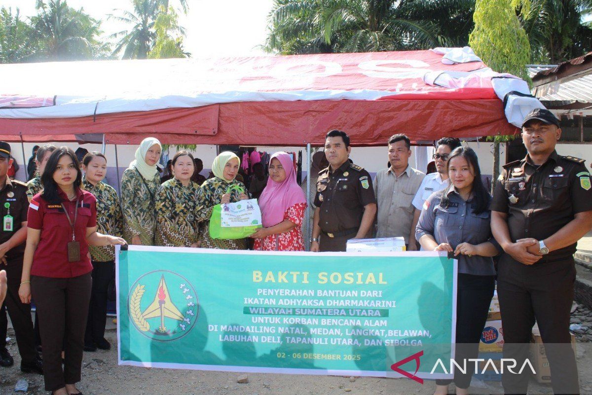 Medan (ANTARA) - Kejaksaan Tinggi Sumatera Utara (Kejati Sumut) bersama Ikatan Adhyaksa Dharmakarini (IAD) Wilayah Sumatera Utara menyalurkan bantuan kemanusiaan kepada masyarakat terdampak bencana hidrometeorologi dan pegawai Kejaksaan yang turut menjadi korban di Kabupaten Mandailing Natal (Madina), Rabu (3/12).