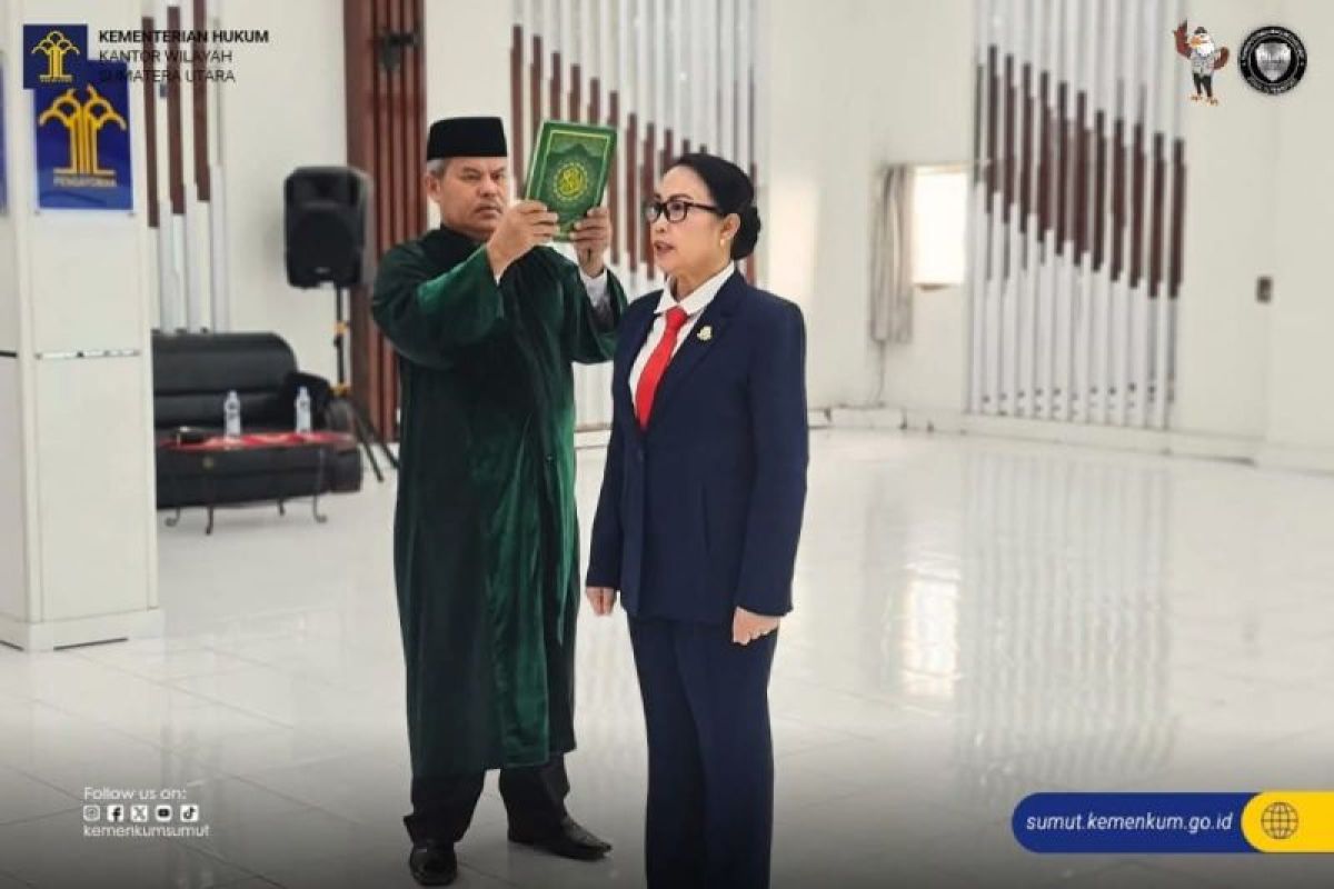 Medan (ANTARA) - Kantor Wilayah Kementerian Hukum Sumatera Utara mengukuhkan anggota majelis kehormatan notaris wilayah Sumatera Utara periode 2025–2028 melalui prosesi pengambilan sumpah/janji yang digelar Senin (8/12).