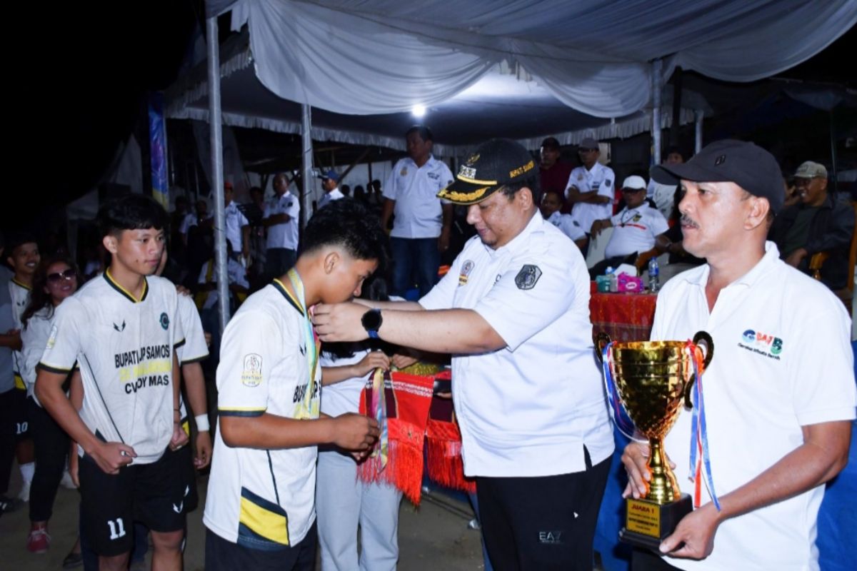 Usai laga, Bupati Vandiko T. Gultom menyerahkan langsung piala bergilir dan hadiah pembinaan kepada para juara I Antap FC.