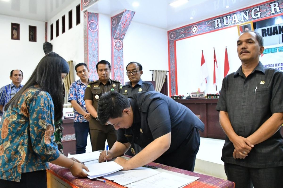 Persetujuan tersebut dituangkan dalam nota kesepakatan bersama yang diteken Bupati Samosir Vandiko T. Gultom bersama Ketua DPRD Nasip Simbolon, Wakil Ketua DPRD Osvaldo Ardiles Simbolon, Sarhochel Martopolo Tamba dalam rapat paripurna yang digelar di Ruang Rapat DPRD Samosir, 28/11.