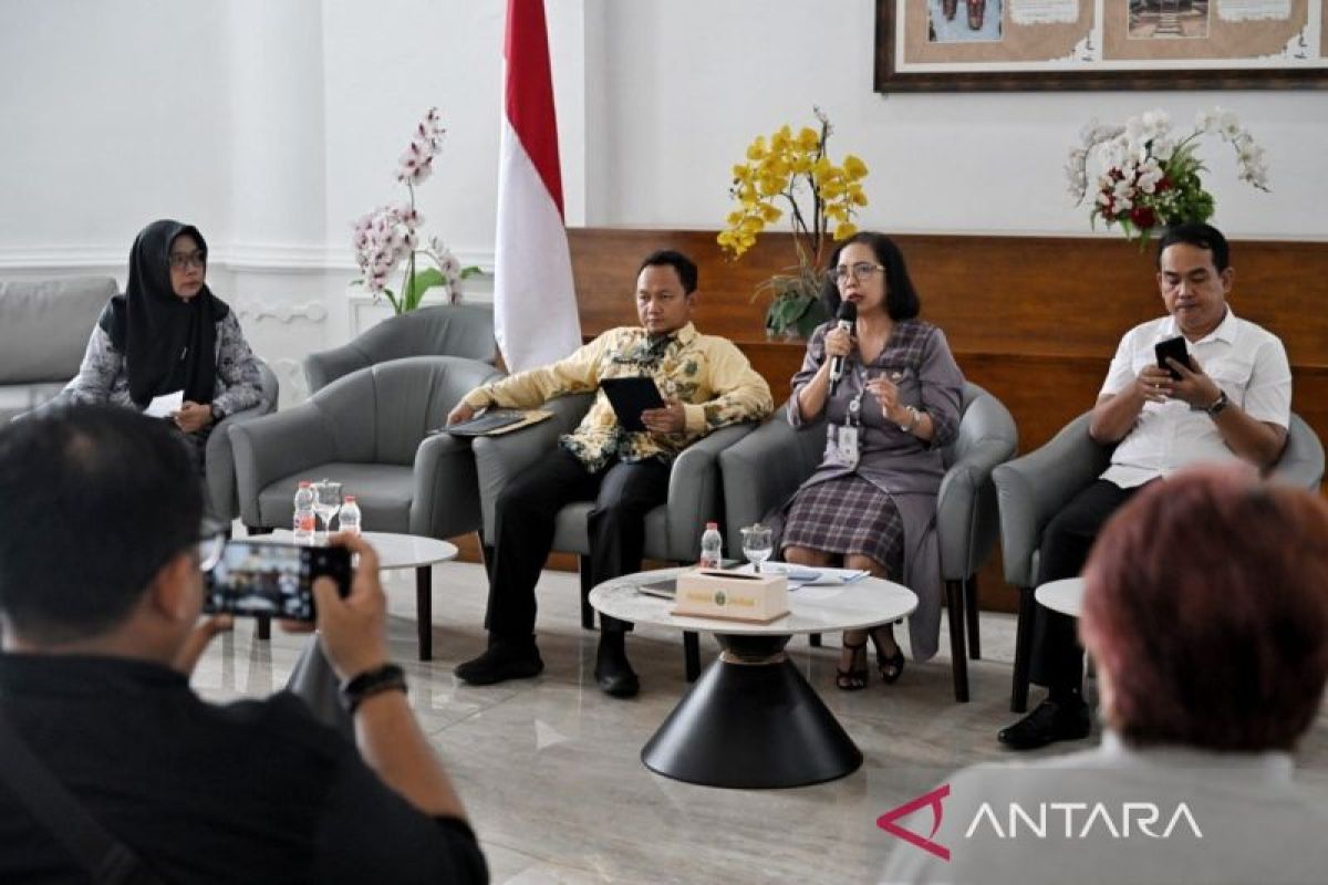 Kepala Biro Perekonomian Setdaprov Sumut Poppy Marulita Hutagalung (kedua kanan) dalam temu pers di Kantor Gubernur Sumut, Jumat (13/2/2026). ANTARA/HO-Diskominfo Sumut